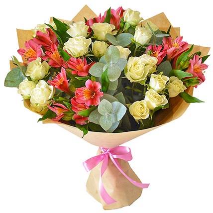 Такой букет, в котором нежность переплетается с огненной страстью, послужит отличным дополнением основного подарка. Контрастного оттенка удалось достичь благодаря красным альстромериям, которые выделяются на фоне нежных белых роз. Что касается эвкалипта, то он удачно дополняет композицию, подчеркнув насыщенность красных оттенков.